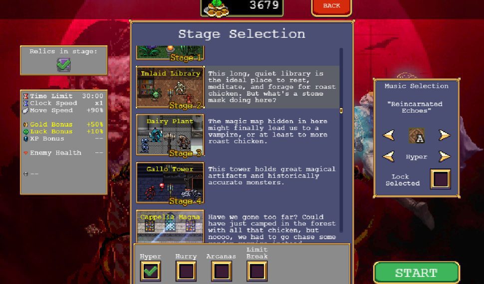 Vampire Survivors saattaa käydä tylsäksi, ja harvat kerrat, kun olen saanut helpot alkupelin siirtymät myöhempään peliin, ovat olleet niitä hetkiä, jolloin Vampire Survivors on hieman laahannut. Onneksi pelinopeuden ja vihollisten haastavuuden säätimiä voi kiristää ja Vampire Survivorsin piilotetut hahmot, haasteet ja erikoistasot palauttivat hauskuuden minulle tylsistymisen jälkeen.